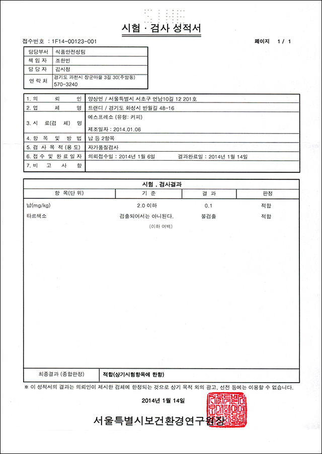 시험 검사 성적서 (2014) 페이지 정보 작성자 관리자 댓글 0건 조회 5,552회 작성일 14-01-22 10:11 본문 목록 답변 이전글2015년 시험 검사 성적서 15.02.05 다음글보건환경연구원 식품검사 회보 (2014) 14.01.22 댓글목록 댓글목록 등록된 댓글이 없습니다.