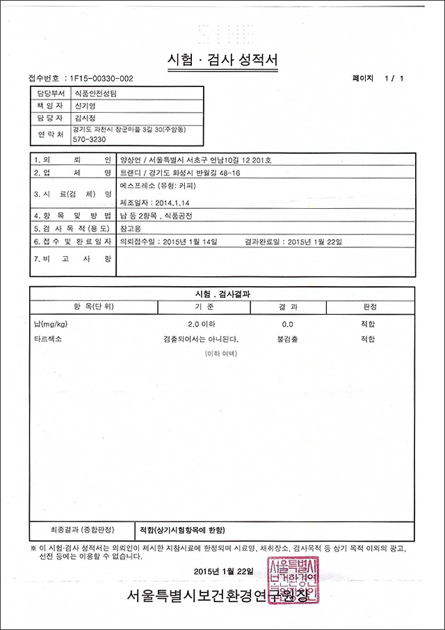 2015년 시험 검사 성적서 페이지 정보 작성자 관리자 댓글 0건 조회 4,722회 작성일 15-02-05 22:55 본문 목록 답변 이전글2015년 서울특별시 보건환경연구원 회보 15.02.05 다음글시험 검사 성적서 (2014) 14.01.22 댓글목록 댓글목록 등록된 댓글이 없습니다.